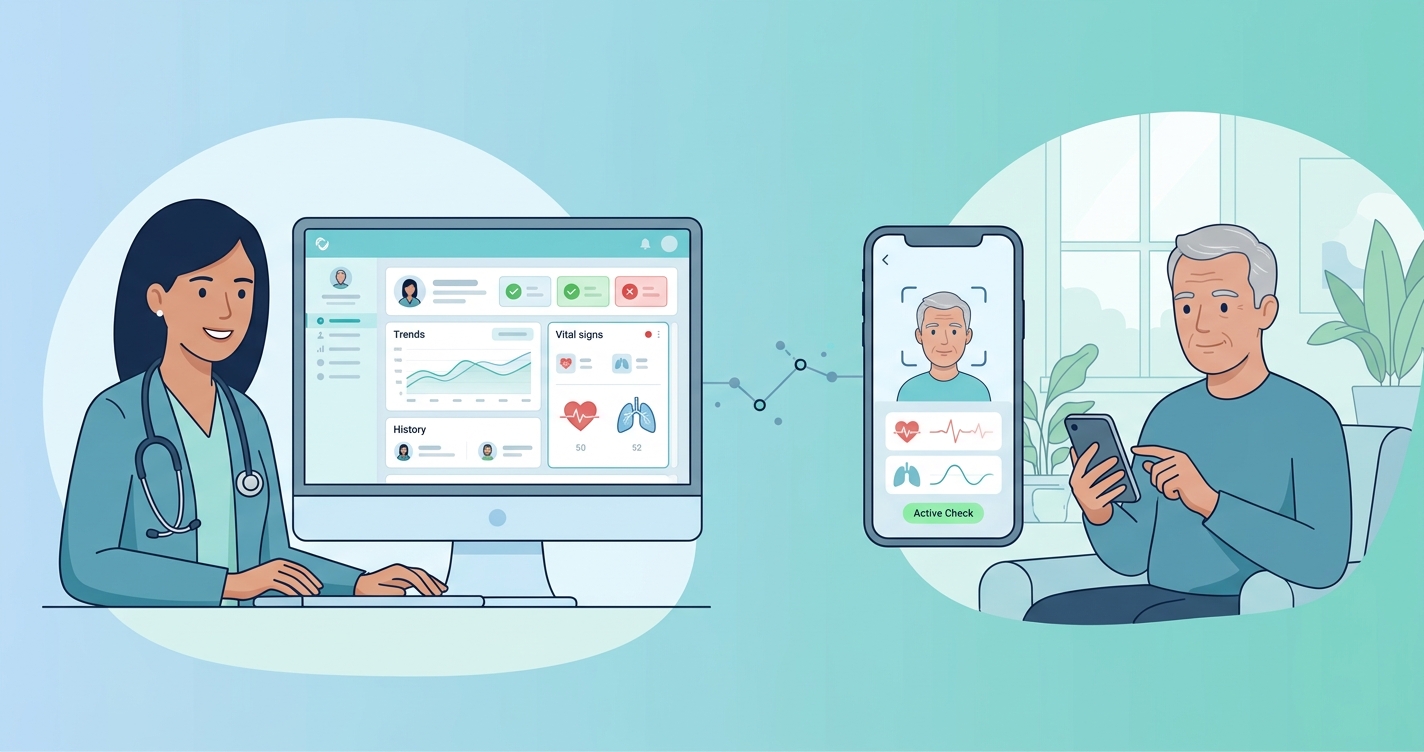 It means placing a brief camera-based vital-sign check-in inside the monthly chronic care management process so staff can review current patient status, update the care plan, and route follow-up more intelligently.
